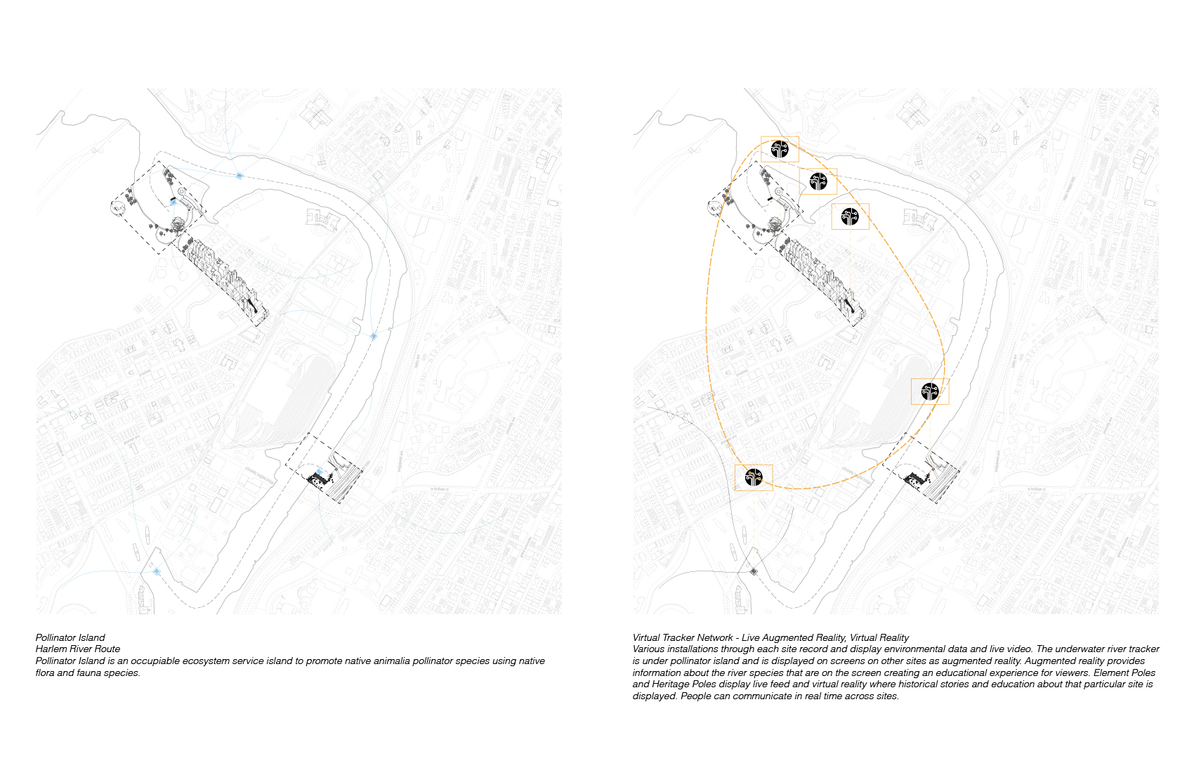 Four Waters Formative is a Living Laboratory for Indigenous ecological knowledge integrating adaptive design, land remediation and historical preservation. Fort Wadsworth (renamed Four Waters Formative) is on Staten Island and is part of the Gateway National Recreation Area as a National Park and is considered federal land. Four Waters Formative acts as a reinterpreted National Park and histrocially preserved military site, with on site education and a place to promote collaboration between the greater public, tribes and federal programs. The program centers around the the Stronghold as a gathering place while the path system weaves together interventions including gazing pods, artificial reefs, pollinator batteries, earth work, Shatemuc Pavilion, the Deer House, the Longhouse, Falcon Bridge and the American Indian Monument; a data collector and visual indicator of live environmental information. Membrane as a means of perception, the gaze, and fortification and various indigenous design principles were explored throughout the project.